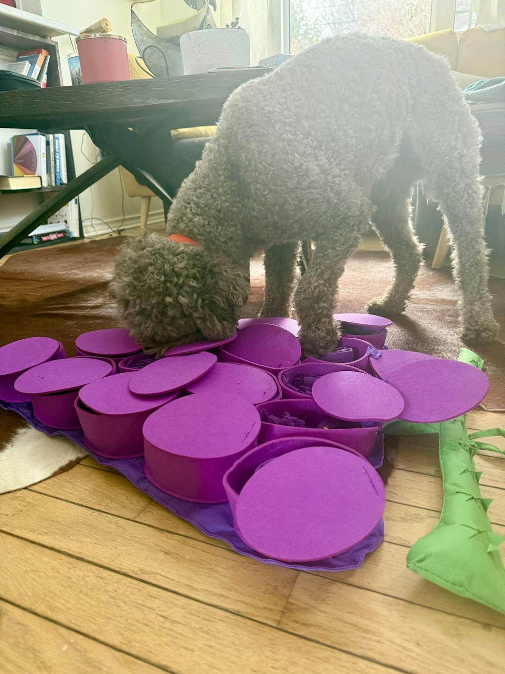 Pets need focus during training. Using a snuffle mat afterward helps them calm down and also with impulse control.