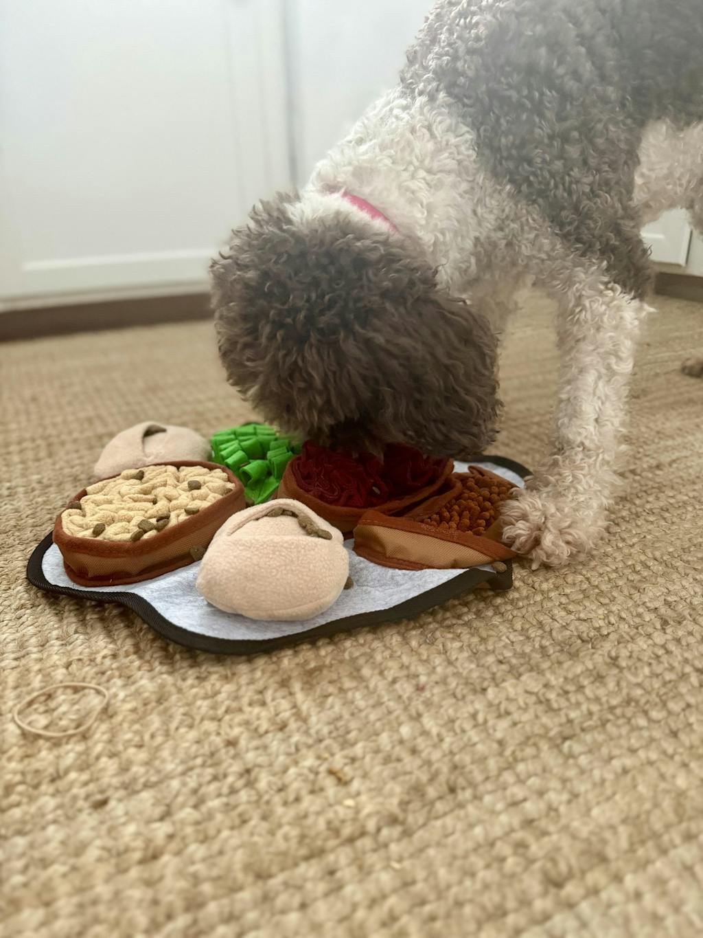 Snuffle mats, such as Juicy Hamburger, Hot Sushi Roll, and Sassy Stingray, are soft fabric mats that look simple but tap into powerful instincts. Pets spend much of their day searching for food. This behavior is deeply rooted and very comforting. Snuffle mats recreate this experience indoors, allowing pets to use their instincts naturally. Sniffing, a scent-based activity, also improves mental stimulation for dogs and other pets who struggle to settle or relax.