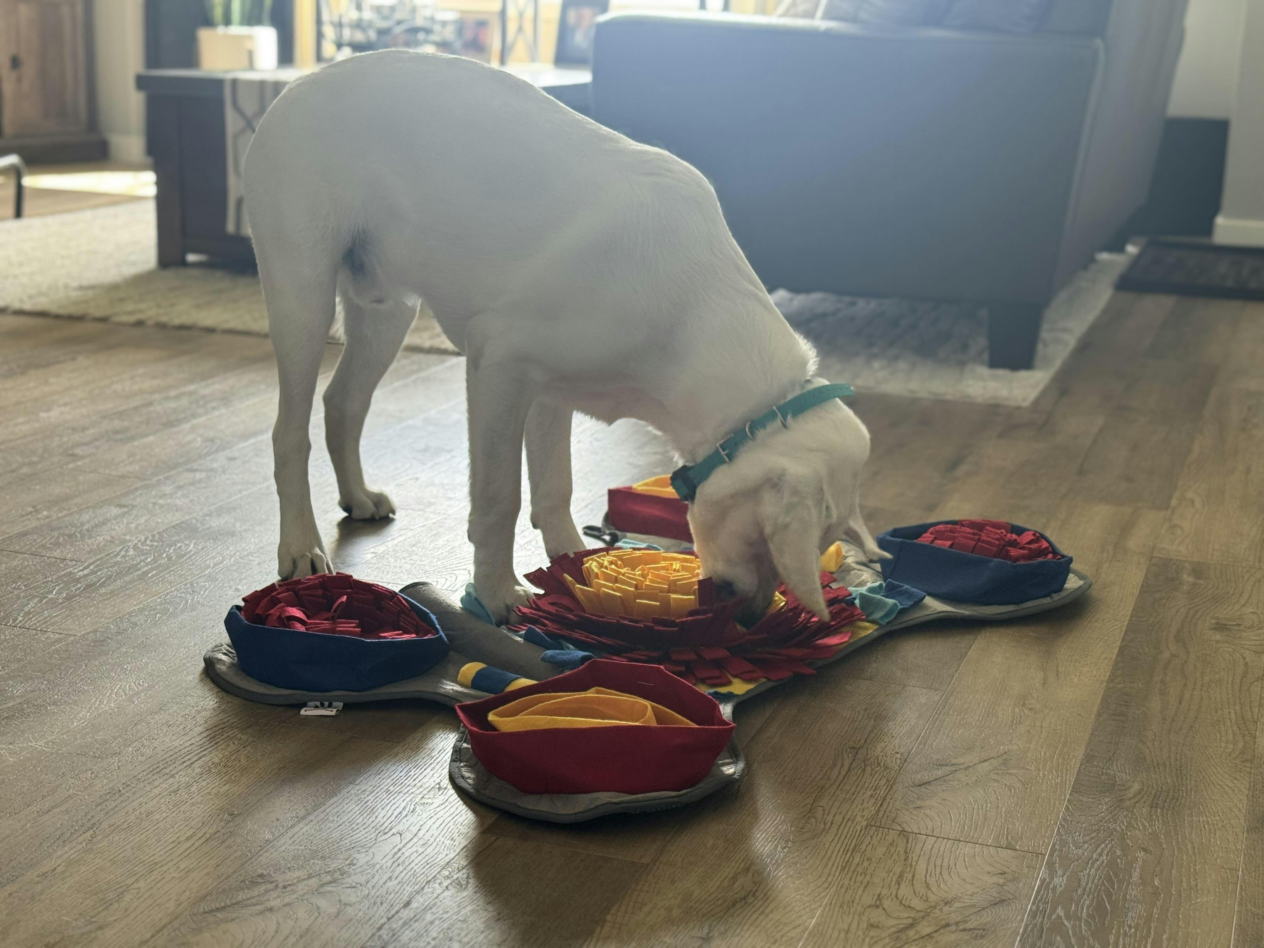 As a pet care business that works with dogs of all personalities, we especially love how this mat encourages calm sniffing and helps tire out energetic pups in a positive way. When it is raining, it is really really hard to tucker the pups out but this makes it so much easier. Whether it’s enrichment time after a walk or a rainy-day activity, this one’s a winner.