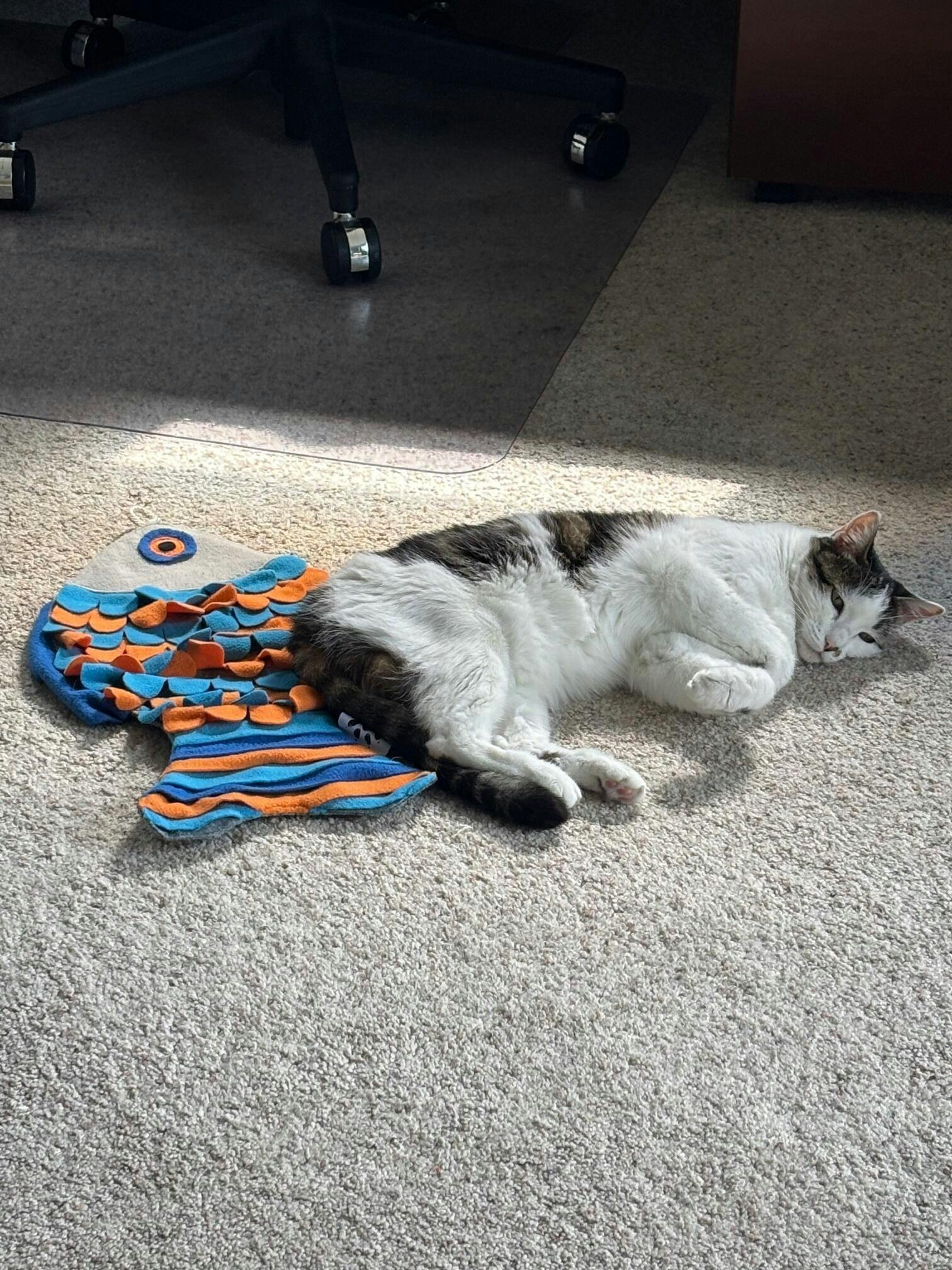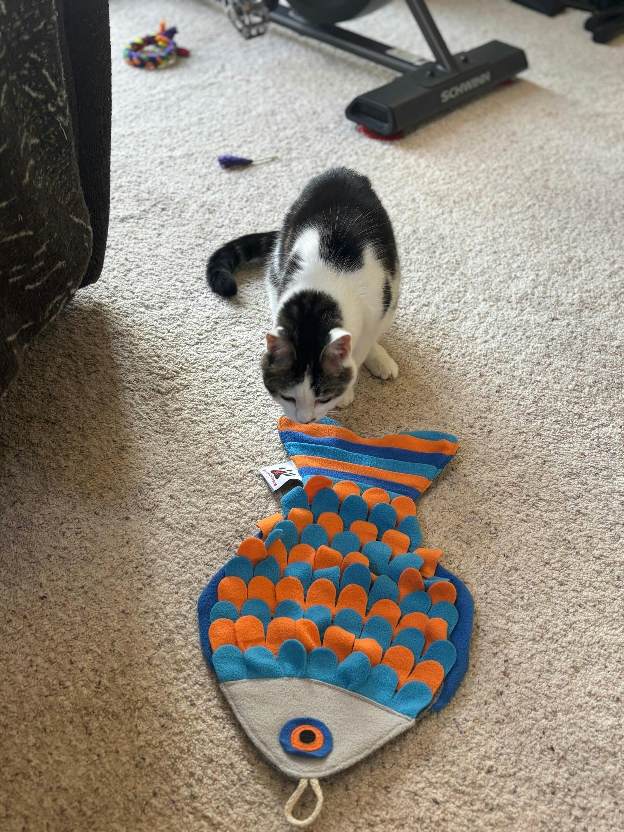 My cat Lexi cannot get enough of the Fishy Affair Snuffle Mat! She's obsessed with trying to find her hidden treats. This is also great keeping her active as sometimes she's a lazy 15 year old cat!